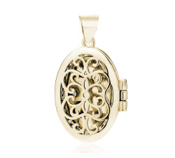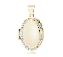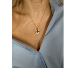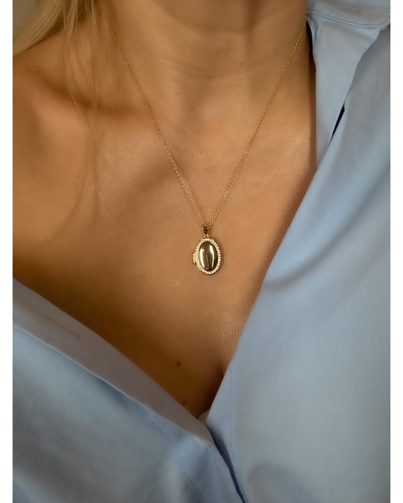 Zawieszka w formie klasycznego medalionu została otoczona ręcznie osadzonymi cyrkoniami, które dodają jej szlachetnego, świetlistego blasku.