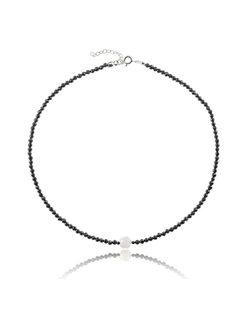 Delikatny naszyjnik wykonany z naturalnego czarnego spinelu, wykończony centralnie białą różą symbolem kobiecej harmonii i wewnętrznego spokoju. Subtelnie odbijające światło kamienie tworzą elegancką, minimalistyczną formę, idealną do codziennego noszenia i wyjątkowych momentów.