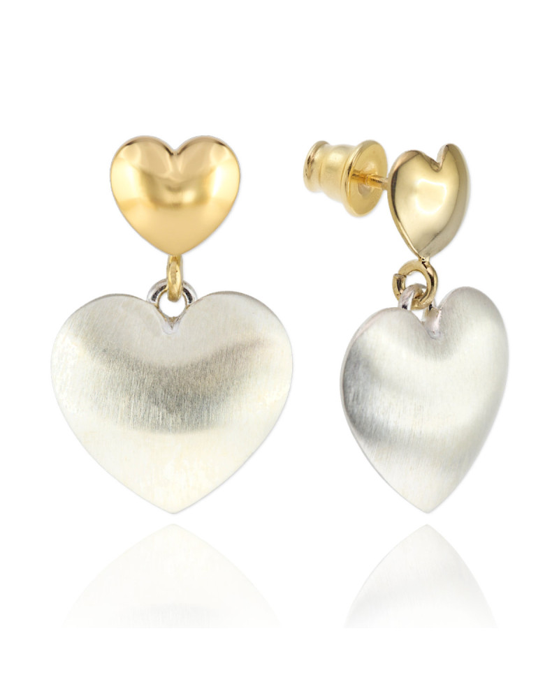 Kolczyki z motywem serca wykonane ze srebra oraz srebra złoconego. Połączenie dwóch odcieni metalu nadaje formie nowoczesny, elegancki charakter. Prosty, ale wyrazisty design sprawia, że kolczyki pasują zarówno do codziennych stylizacji, jak i bardziej eleganckich zestawów.