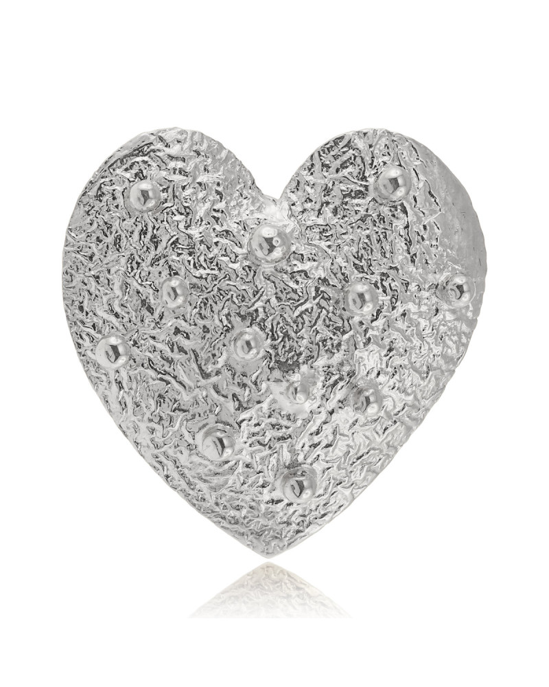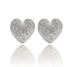 Kolczyki w kształcie serca, wykonane ręcznie z charakterystyczną, nakrapianą fakturą, która subtelnie odbija światło. Każdy egzemplarz jest niepowtarzalny delikatne nieregularności są naturalnym efektem ręcznego rzemiosła i znakiem autentyczności.