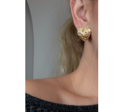 Kolczyki w kształcie serca, wykonane ręcznie z charakterystyczną, nakrapianą fakturą, która subtelnie odbija światło. Każdy egzemplarz jest niepowtarzalny, delikatne nieregularności są naturalnym efektem ręcznego rzemiosła i znakiem autentyczności.