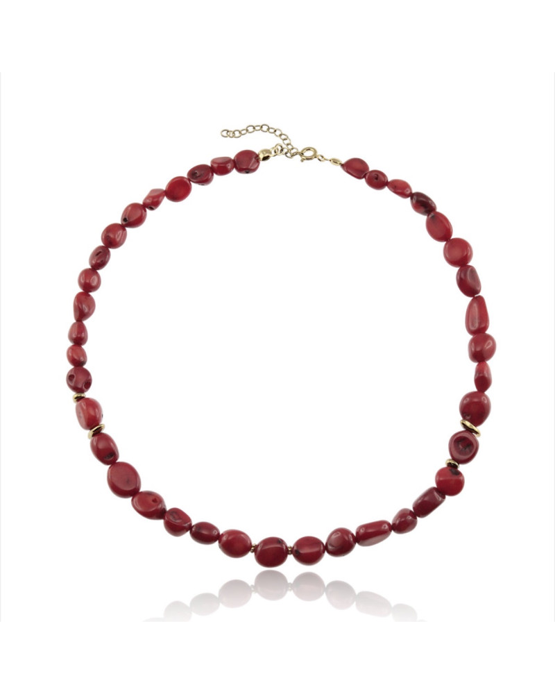 Naszyjnik wykonany z koralu o nieregularnej, organicznej formie. Każdy kamień ma unikatową strukturę i subtelne różnice w odcieniu czerwieni od głębokiego karminu po ciepłe, malinowe tony. To właśnie ta naturalna różnorodność nadaje mu autentyczny, szlachetny charakter.