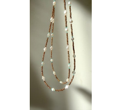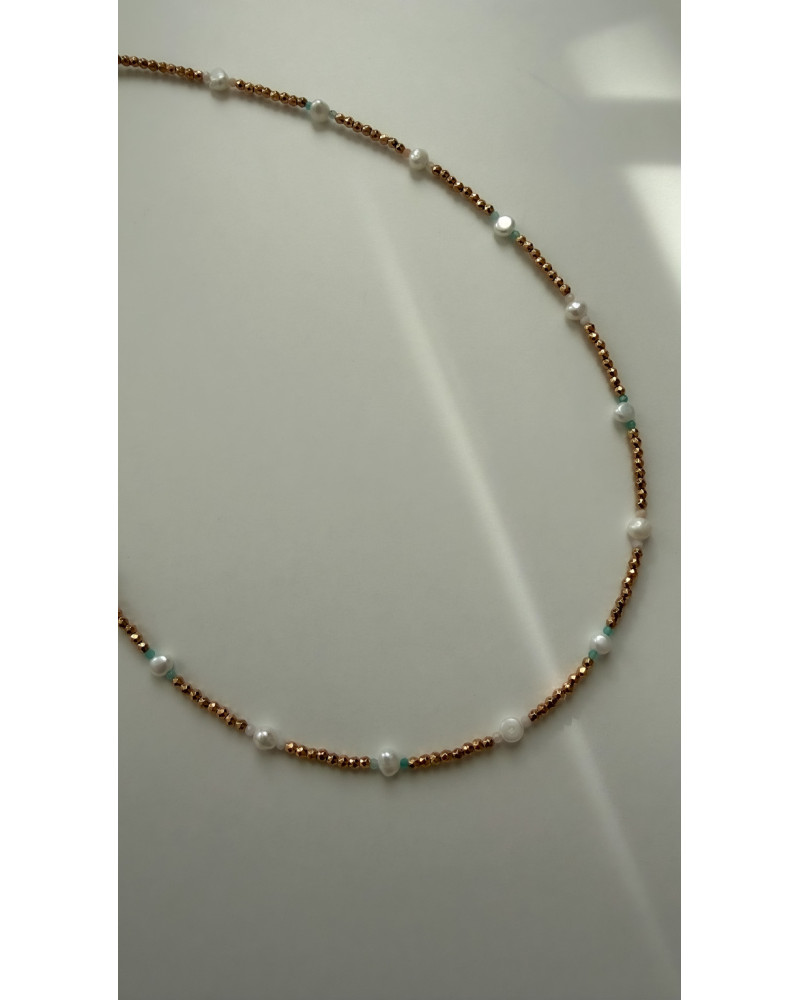 Naszyjnik wykonany z hematytów, pereł oraz amazonitu.